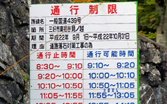剣山から次の目的地へ向けて国道を進んで行くと、途中で道路工事による時間帯通行止が行われていた。現時刻11:20で通行可能になるのが11:55から。これは少々痛い…30分も足止め。時間まで他に行くところも無いし、剣山まで戻っても仕方ないので、日陰に車を移動して暫しの仮眠。まぁ、通行できるだけマシだと思う事にしよう。終日通行止めだったら迂回に100kmは走るハメになっていただろうから。 |