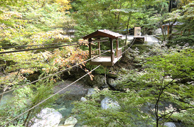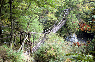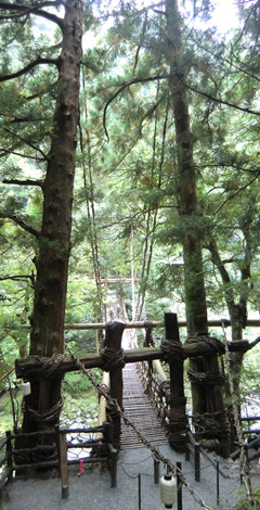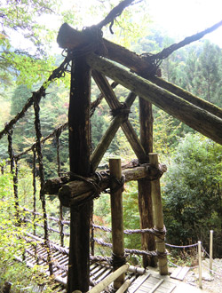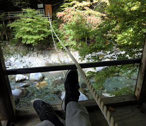 男橋を渡って遊歩道を進むと、今度は長さ約20mの女橋。橋の長さも川からの高さも男橋の半分くらい。そこへ他の観光客がやって来て女橋を渡り始める。高いところが苦手なのか、つるにしがみ付くようにして一歩一歩踏みしめる様に歩き、ゆっくりゆっくり時間をかけてやっと渡りきる。やはりこの手の橋はダメな人は本当にダメのよう。 |