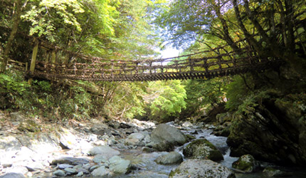 奥祖谷二重かずら橋から30kmほど車を走らせ、次は祖谷のかずら橋へ。奥祖谷と同じくツルを編んでつくられたつり橋で、長さは約45m。こちらも橋の通行料は500円。ふたつのかずら橋と野猿がある奥祖谷に対し、こちらはひとつのかずら橋だけなので割高に感じる。祖谷のかずら橋は「日本三奇橋」のひとつらしい。そんな日本三大があったとは知らなかった。 |