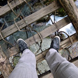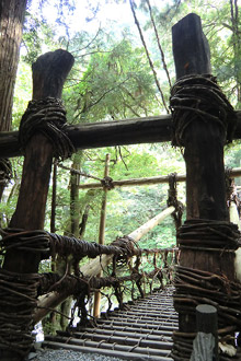 吊り橋の足元はスカスカ。高所恐怖症の人には渡れそうにない橋。高所が好きな自分にはおもしろい。速歩きでスタスタ歩くと結構揺れる。強度は大丈夫なのかと束ねられたツルをよく見てみると、中に金属製のワイヤーが入っている。なんだ…100%天然素材ではなかった。 |