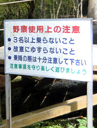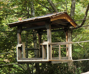 女橋から遊歩道をさらに進んで行くと、川を渡るための宙に浮く乗り物発見。野猿という、手でロープを引いて動かす人力ロープウェイ。実際に乗って川を渡ることが出来るので早速チャレンジ。野猿は真ん中辺りで止っていたので、ロープを引いてこちらの乗り場に着ける。それから野猿に乗り込み出入り口の引き戸を閉める。そしてロープを引いて対岸へ移動。これは面白い! |