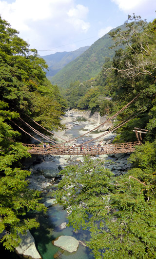 通行制限の酷道を進んで奥祖谷二重かずら橋へ。名前の通りふたつのかずら橋がある。駐車場に車を停め通行料500円を払い、遊歩道を歩いてかずら橋のある川へ下りて行くと、大きな木とツルで出来た吊り橋が見えてくる。長さ約42mの男橋というかずら橋。 |