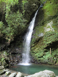 かずら橋のすぐ側には落差50mの琵琶の滝がある。落差50mとあるがそれよりも随分小さく見えたので、滝の上部まで見えていないのかもしれない。とりあえず見た目に特別な印象は無く、普通の滝と言った感じ。 |