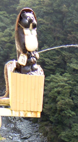 ししそばは1300円。名前の通りしし肉が入ったそば。おそらく初めて食べるしし肉、これがおいしい。なるほど、しし肉はこんなにおいしいものだったのか。祖谷渓の上にある店のオープンデッキには、「度胸狸」という小便小僧ならぬ小便狸が放水中。なかなかおもしろいじゃないか。 |
