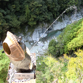 お次は祖谷渓のシンボルである本当の小便小僧。谷底から200mの岩の上に立っている。しかし放水はされておらず。もともと放水するようにはつくられていない?昔この岩が度胸試しに使われていたという逸話にちなんでつくられたとか。度胸試しで失敗したら終わりだよ、これ。この小便小僧、写真だと断崖を見下ろす印象的な画だが、狭い山道の脇に小さな小僧がぽつんと立っているだけで、実際は観光スポットと言うには印象が弱い。 |