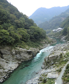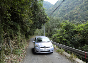 時間は15:00を過ぎ、空にはいつの間にか雲が広がっていた。せっかくの祖谷渓の眺めも霞んでしまっている。どうも毎日昼過ぎから雲が増え始め、夕方までに曇りに変わっている気がする。季節柄そういうものなのだろうか。小便小僧から祖谷渓沿いの細い山道を10kmほど走る。道幅が狭く運転が面倒くさいし、渓谷の車窓風景は単調でつまらないしで、祖谷渓はドライブコースとしてはちっとも楽しくない。 |