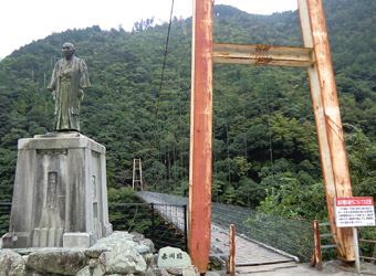 祖谷渓の細道を抜けて、吉野川沿いの国道を南下していると、渓谷に架かる長い吊橋があるので車を停める。赤川橋という全長約110mの吊橋で、橋の隣に赤川庄八像(誰?)が立っている。足場は木板が並べられているが少々隙間がある。橋から川を見下ろすと結構な高さで、先に訪れたかずら橋よりもずっとスリルがある。橋の金属部は全体的に錆びていて、見た目がちょっと不安な橋。 |