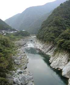 赤川橋のある吉野川の渓谷を小歩危峡(こぼけきょう)、小歩危から南に続く渓谷を大歩危峡(おおぼけきょう)と言い、深く切り立った断崖の渓谷が続いている。流れが速い難所で大股で歩くと危ないから大歩危、日本一の激流とも言われ小股で歩いても危ないから小歩危、という意味で呼ばれているらしい。そんな渓谷も曇り空で景色は全く映えず。車窓からの風景を楽しむことも無く淡々と車の運転を続ける。 |