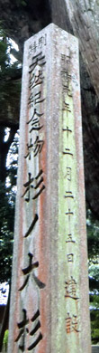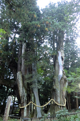 この日最後の目的地、杉のオオスギに着いたのは空が暗くなり始めた17:00過ぎ。八坂神社の境内にある推定樹齢3000年の大杉で、南大杉と北杉の二本が向かい合うように立っている。南大杉は根元周囲約20m、高さ約60m。北杉は根元周囲約16.5m、高さ約57m。日本最大の杉と言われ、国の特別天然記念物になっている。確かに大きく立派な杉だが、補強のためと思われる板が沢山貼られているのが痛々しい。そして境内はオオスギで空が覆われ一層暗く、なんとも言えない雰囲気をかもし出している。 |