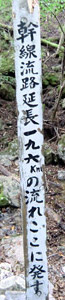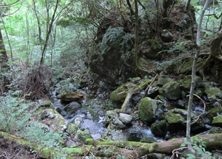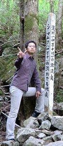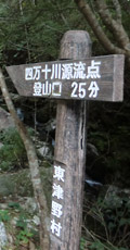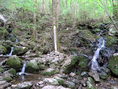 四万十川の源流は2つの沢からなっていて、その合流点に碑が立っている。全長196kmの川の始まりの地。旅行3日目に観光した四万十川は川幅がそれなりに広かったが、こんなに流量の少ない源流から始まっている事を考えるとちょっと不思議な感じもする。川の知識は無いのでよく分からないが、とりあえず自然というヤツは凄いと思った。山歩きをして体が熱くなり喉が渇いたので、源流の水を手ですくって飲んでみる。冷たくておいしいので沢山飲んでしまった。飲んでも大丈夫だよな… |