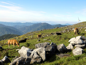 カルストとは石灰岩などの侵食によって出来た地形で、四国カルストは日本三大カルストのひとつ。丘陵地には石灰岩がゴロゴロ転がっていて、そこに牛が放牧されている。カルストの中央には二機の風力発電機が建っている。とにかく眺望がよくスケールの大きい眺めで、旅を始めてからここまでの間に見てきた風景の中で一番のインパクト。本当にいい場所だ。四国カルストを通る道路は高知県と愛媛県の県境に沿って延びているため、車を運転しているとカーナビから「高知県に入りました…愛媛県に入りました…高知県に…」と、しつこいくらい何度もくり返しアナウンスが。。 |