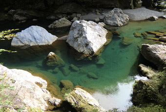 四国カルストにある周辺観光地の案内板を見て、「八釜の甌穴群」というスポットに目が留り、次の目的地に向けて走る国道沿いにあるのでついでに観光する事に。四国カルストから酷道を北に10kmほど進み、甌穴群がある八釜渓谷まで続く遊歩道の入口に到着。入口には「行き20分 帰り30分」と書かれた案内板。つまり行きは下り道で帰りは上り道という事か。念のためトレッキングシューズに履き替えて遊歩道に入る。鬱蒼と茂る木々に囲まれた遊歩道は狭く、足を滑らせたら渓谷へ転落する危険もあるので、常に足元に注意を払いながら歩く。 |