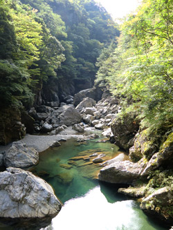 面河渓は約10km続く四国最大の渓谷。道路から川まで下りる遊歩道があるのではないかと思ったが、それらしいものは目に入らず面河渓を通り過ぎてしまう。現在地確認のため道路脇のパーキングに車を停めたところ、そこは「御来光の滝」の展望スポットだった。しかし辺りを見回してもそれらしいものは見えない。もう一度よく見回して遠くにある山肌に目をやると…あった。日本の滝100選に選ばれている落差102mの滝だが、2、3kmは離れているので細い糸のようで見応えゼロ。滝壺まで行くには険しく危険な山道を歩かねばならないらしい。 |