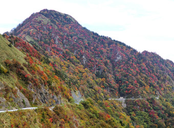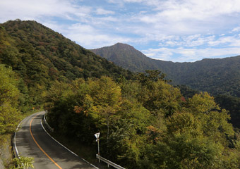 快適なドライブができる石鎚スカイラインは石鎚山駐車場が終点で、それから先は狭い県道を走って今治市を目指す。またまたすれ違いも面倒な細道。ただ景色はいい。視界いっぱいに広がる山々の風景の中に、特徴的な切り立った岩山や所々紅葉した木々が見られる。目を惹く景色が沢山ある山道。残念なのは空一面に雲が広がり、日差しが遮られてしまっている事。どうして毎日昼過ぎから曇ってしまうのだろう。10月の四国の天気はいつもこんな感じなのだろうか。 |