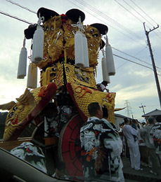 車の横を山車が通る |