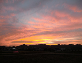 今治市に入った17:30頃から曇り空が紅く染まり始め、やがて綺麗な夕焼け空に。鮮やかな夕焼けを見るのは久しぶり。毎度の曇り空にガッカリしていただけに、想定外の夕焼け空を見られて得した気分。でも欲を言えば夕日が日没していくのを見たいところ。日が沈み暗くなってから今治市の入浴施設に入り、先に食堂で夕食を済ませ空腹を満たしてから入浴。入浴後は脱衣所内にある休憩所でテレビを見て時間潰し。 |