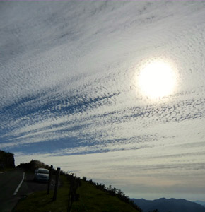 四万十川源流から狭くて危なくて面倒な山道を引き返し、今度は四国カルストへ続く山道へ。しかしまたしても細道が長々と続き、その上今度は対向車がしばしばやってくる。しかもダンプカーや重機を運ぶトラックばかり。こんな狭い道をよく走って来れたなと思うような大型車まで。トラック運転手の運転技術に感心してしまう。そしてそんな大型車と狭い道で向かい合う時は、必然的に小型車を運転する自分がすれ違いできる場所までバックする事になる。かなり面倒くさい… そんな不便極まりない山道を走りきると、かなり高い所まで登って来たようで周囲の山々を一望。そして四国カルストへ。 |