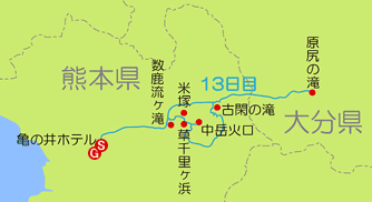 空は相変わらずの曇り空。ホテルロビーにあるパソコンで天気予報を確認すると、やはりこの先数日間は曇天が続く予報。天気で何よりも心配なのが、24日の軍艦島上陸クルーズが決行か中止かということ。怪我で旅を中断することになってしまったので、せめて軍艦島の上陸観光だけはしておきたいところ。この日の予定は午前中から阿蘇山の観光をするつもりだったが、天気予報では午後から少し晴れる事になっていたので、結構楽しみにしていた阿蘇山観光は午後にまわし、午前中は阿蘇山の東にある大分県の原尻の滝へ行くことに急遽変更。フロントでチェックアウトと連泊の予約を済ませ、ホテルを9:00出発。 大きな車中泊の旅で13日目と言えば、日本一周でも北海道一周でもスピード違反で切符を切られた不吉な日数。本当に凄い偶然だ。二度あることは三度…あっては困るので、走行速度には十分注意しようと心掛ける。 |
