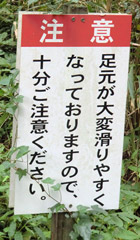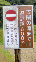 12:00を過ぎても天気は曇りのまま。阿蘇山へ行く前にもう一箇所寄り道しようと地図を眺めてみるが、近場でいい場所が見当たらず、仕方ないので阿蘇山へ向けて来た道を引き返す。時間に余裕があるので阿蘇山をぐるっと囲むように走ろうと思いつき、途中から阿蘇山南側へ向かう道に入る。と、古閑の滝と書かれた看板に目が留まる。気になり看板の指す方へ車を進めると駐車場に着き、滝まで徒歩600mとの案内が。ちょっとした寄り道にしては微妙に遠いが、折角なので駐車場から続く遊歩道に入る。しかも途中から山道になり、足元が滑りやすいとの注意書きの看板。もう絶対に転べないというのに…しかしもう引き返す訳にはいかないっ! |