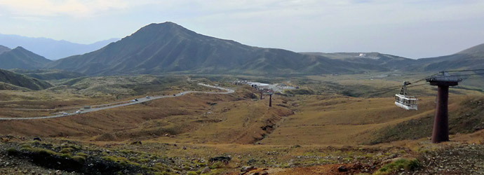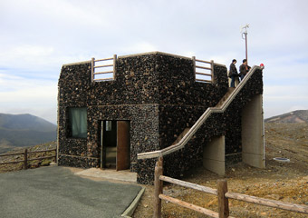 阿蘇山の山道を暫く走ってロープウェイの駅に到着。阿蘇山の観光スポットとして有名な中岳火口までは、阿蘇ロープウェイか有料道路の阿蘇山公園道路で行けるようになっている。最初はロープウェイに乗って行こうと思ったが、有料道路を利用した方が早く上まで行けそうだったので、ロープウェイには乗らず車で中岳火口へ。 |