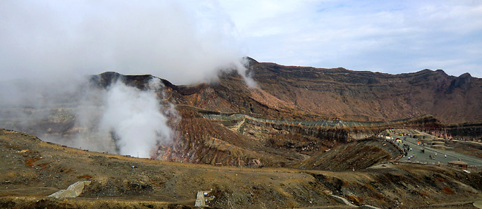 噴煙の上がる中岳火口の前まで行くと、ツンとした酸性の匂いが鼻を突く。子供の頃に学校の理科の実験で嗅いだような刺激臭。火口にはエメラルドグリーンの湯溜まりあるが、噴煙が多くてよく見えない。それから噴煙はどんどん量を増して行き、やがて湯溜まりが全く見えなくなってしまう。刺激臭も一層強くなり、自分も周りの観光客もむせはじめる。ちょっとガスが強過ぎじゃないかと思ったその時、避難命令の放送が流れる。そして係員による誘導で観光客は駐車場まで避難する事に。 |