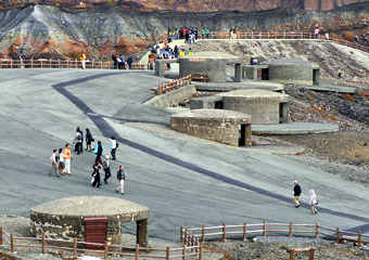 噴煙は落ち着いてエメラルドグリーンの湯溜まりがはっきり見えるように。非常に鮮やかで濃い色をしている。中岳には7つの火口があり、火山活動をしているのは第1火口ひとつのみ。現在第1火口の状況は常に監視されていて、噴火の予測が容易に出来るので観光する上で危険はほぼないらしいが、1958年と1979年には突然の噴火により多数の死者が出ている。火口前の遊歩道には「お願い地蔵さん」なるものが置かれている。何のご利益がある地蔵なのか説明書きが無いので、何をお願いすればいいのか分からない。 |