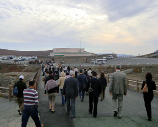 ガス濃度が危険レベルに達したため、中岳火口を見物できる遊歩道は立入禁止になってしまう。まだほとんど観光していないのに… これで中岳の観光を終えるのはあまりにも損なので、立入制限が解除されるまで駐車場から景色を眺めたりして時間を潰す。立入制限解除を待つ観光客の中からは、中国語や韓国語が沢山聞こえてくる。阿蘇は海外でも有名な観光スポットなのだろうか。そして避難から15分ほど経って待ちわびた立入制限解除。再び中岳火口へ。 |