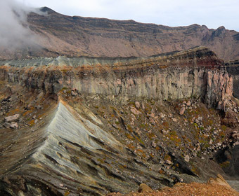 特徴的な火口壁の地層 |