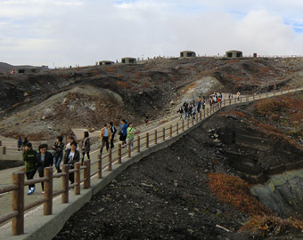 火口を見学しているうちに再び噴煙が増え始め、また湯溜まりが見えなくなってしまう。ガスの刺激臭も再び強くなる。再度避難命令が出ないうちに、火口周辺の遊歩道を歩いて中岳観光。が、途中でやっぱり避難命令の放送が流れ、急ぎ足で遊歩道を歩いて駐車場へ戻る。いつもこんな頻繁に避難命令が出ているのだろうか。とりあえず一通り観光できたので車に乗り中岳を下りる。 |