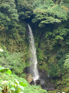 山道を暫く歩いていると、目の前に絶壁が見え始める。一方足元は落ち葉や湿った岩場などでどんどん滑りやすくなり、細心の注意を払って歩く。そしてやっと断崖絶壁の目の前にある展望所に到着。高い絶壁の上から流れ落ちる滝の水量は少なく、途中から霧状になって消えている様相がちょっと神秘的でもある。古閑の滝は落差80mの男滝と、落差100mの女滝の2筋からなる滝らしいが、訪問時は1筋の滝しか見えなかった。普段よりも水量が少なかったのだろうか。 |