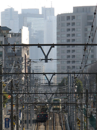 鉄橋付近の踏切より新宿方面の眺め |