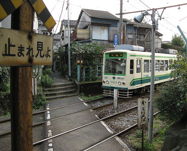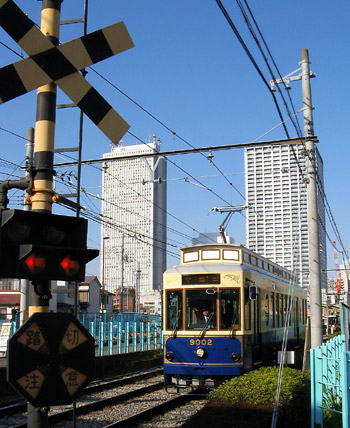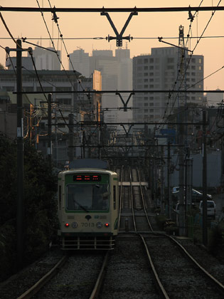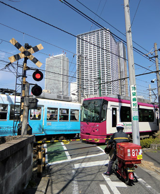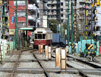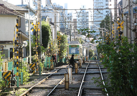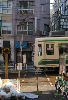 住宅密集地の中、民家の真横を走る都電。下町情緒ある昔の面影を残す風景。細い路地が沢山ある為、数メートル間隔で踏切が並ぶ所も。近隣住民への配慮か、住宅地にある踏切の警報音は鳴り始めて数秒で音量が小さくなる。 |