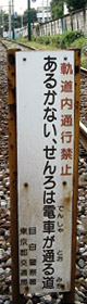 雑司が谷を過ぎると線路は東池袋の住宅密集地に入っていく。細い路地が迷路のように入り組んだ住宅地の中には、遮断機も警報機も無い踏切もある。路面電車の踏切には大抵「軌道内通行禁止」と書かれた看板がある。入り組んだ路地よりも真っ直ぐな都電軌道内を歩いたほうが楽なので、線路内を歩く人をちらほら見かける。 |