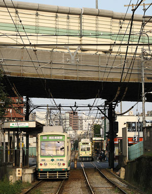 首都高速道路の下にある東池袋四丁目停留場。上りと下りの停留場の間には大通り。都電は基本的に大通りと交差する踏切には遮断機が無く、車と同じように青信号で発車する。 |