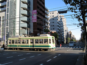 向原停留場が挟む東池袋春日通りを渡り、長い下り坂を走ってJR山手線の駅がある大塚駅前へ向かう。坂の勾配はそれ程でもないが、都電は坂を下りる時はかなり減速して安全運転。 |