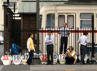 撮影会の間、係員がちょくちょく車体正面のナンバープレートを交換していた。プレートに描かれた番号の下には、雑誌やお菓子などの広告が描かれている。番号は行き先を意味していたのかな? |